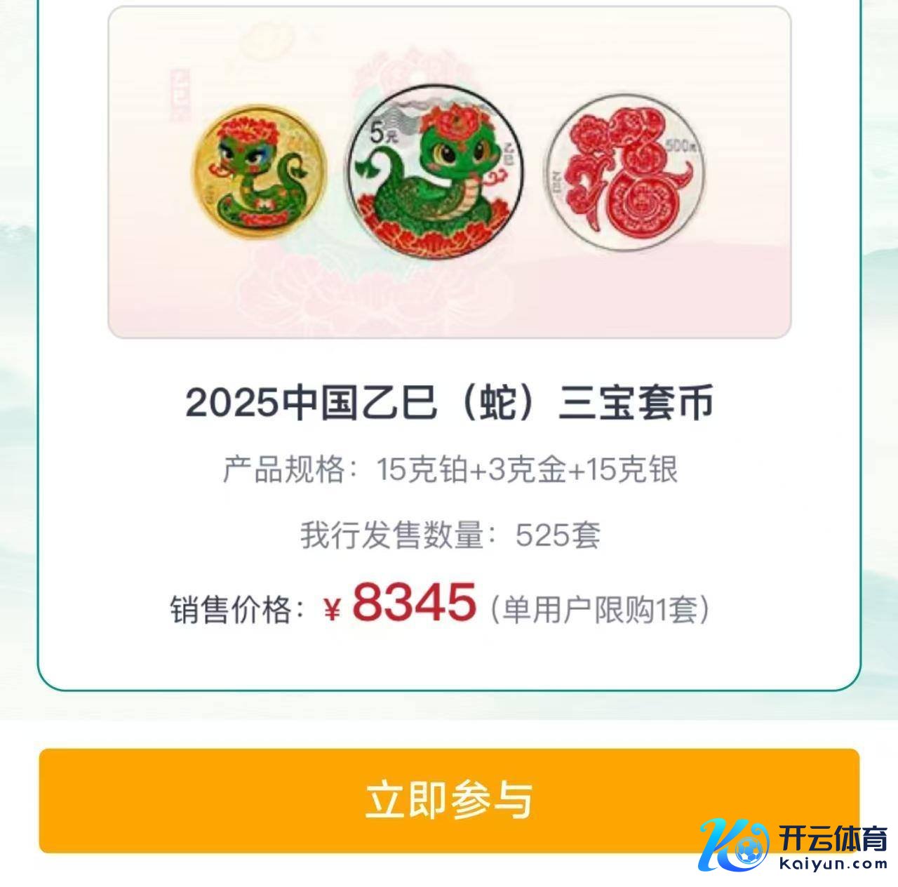 如开导银行销售的2025中国乙巳(蛇)年500克金币,价钱为438000元/套,每名用户限购2套。此外,不少银行还凭证居品规格和组合搭配情况笃定不同销售价钱。