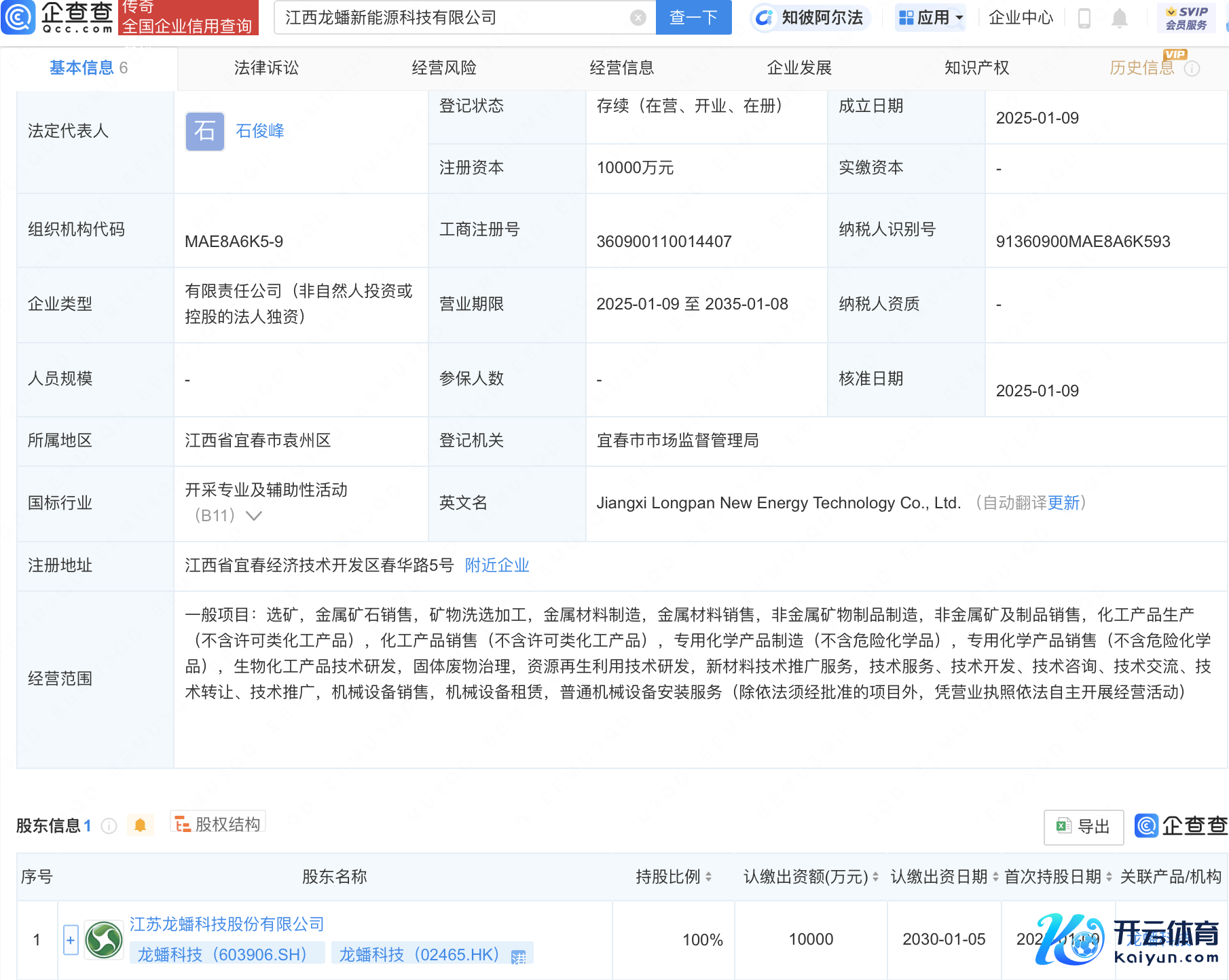 企查查APP表示,近日,江西龙蟠新动力科技有限公司确立,法定代表东说念主为石俊峰,注册本钱1亿元,意见边界包含:金属材料制造,金属材料销售,非金属矿物成品制造,非金属矿及成品销售等。企查查股权穿表表示kaiyun在线登录入口,该公司由龙蟠科技(603906)全资握股。