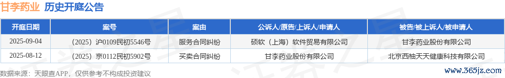 案号:(2025)京0112民初5902号审理法院:北京市通州区东谈主民法院案由:生意协议纠纷当事东谈主信息: 原告/上诉东谈主:甘李药业股份有限公司 被告/被上诉东谈主:北京西柚天天健康科技有限公司开庭日历:2025年8月12日凭证统计,近一年内以甘李药业股份有限公司为当事东谈主的历史开庭公告有2则,其中案由为“生意协议纠纷”的公告以1则居首,其次为“工作协议纠纷”有1则。历史开庭公告如下: