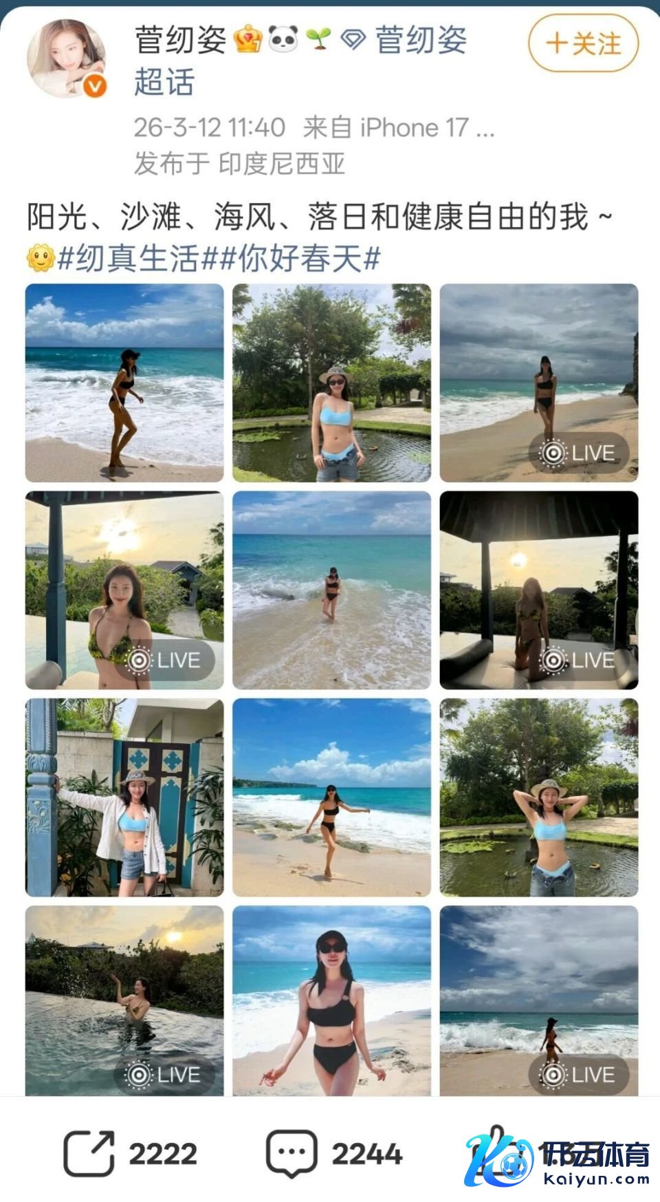 刷微博的小伙伴,猜测王人刷到菅纫姿的海边度假照了吧?3月12号,菅纫姿在微博发了一组比基尼写照开yun官网,配文写着“阳光、沙滩、海风、落日和健康解放的我”,一下子就火上了热搜,批驳区全是夸她的声息。
