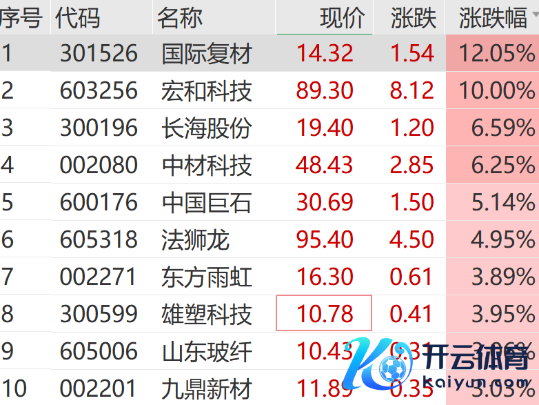 建材板块同步走强,玻纤见解股火热。宏和科技涨停,总市值站上800亿元。海外复材涨超10%,长海股份、中国巨石等纷繁大涨。
